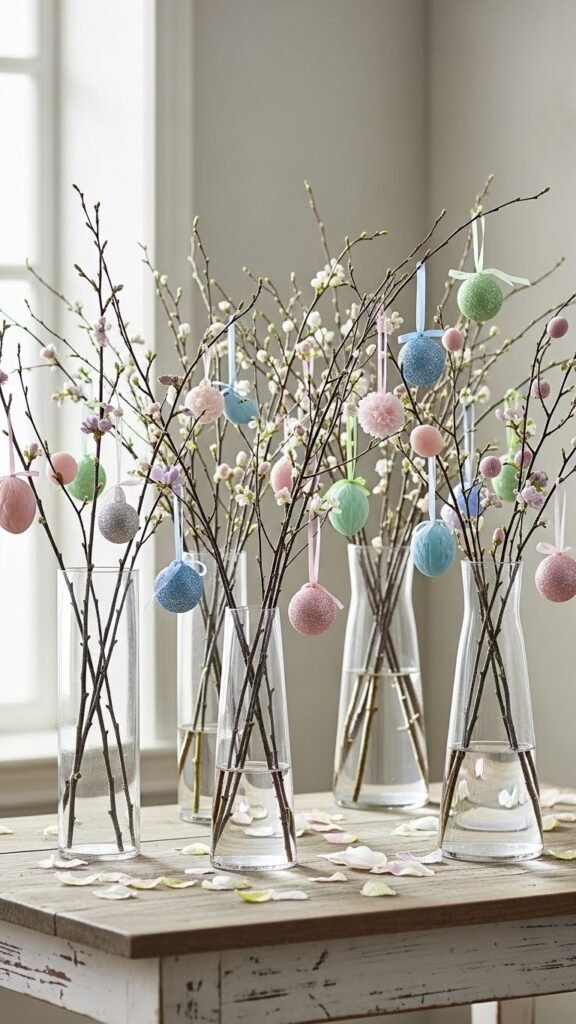 You’ll love using pastel branchings and ornamented twigs in simple vases, mixing real branches with faux for longevity.