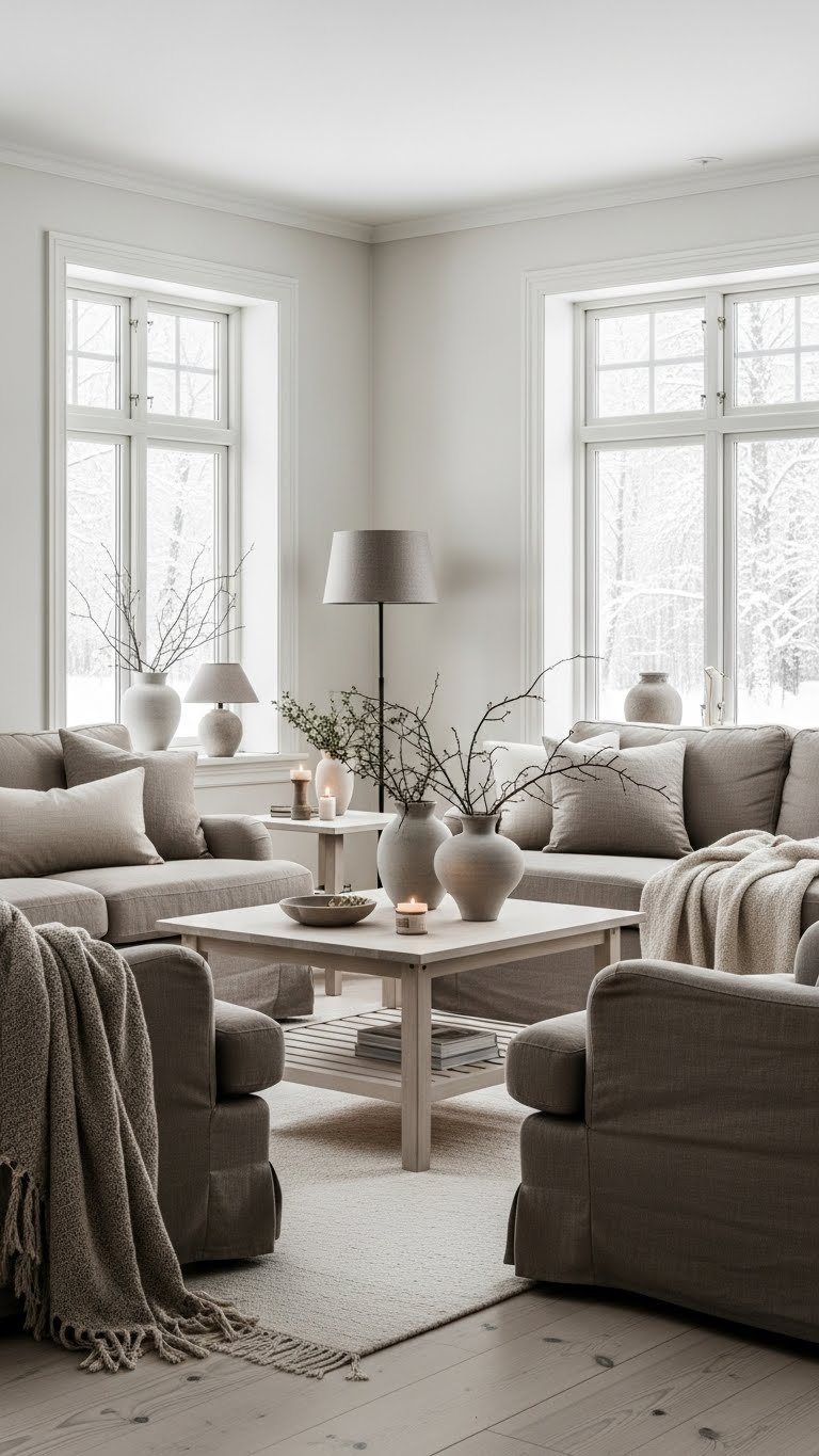 When you strip color down to soft creams, warm grays, and muted taupes, your space instantly feels calmer and more intentional; these quiet tones let texture and light become the focal points of your winter decor. You’ll choose winter neutrals like soft greys, linen whites, and muted taupes to free the room.