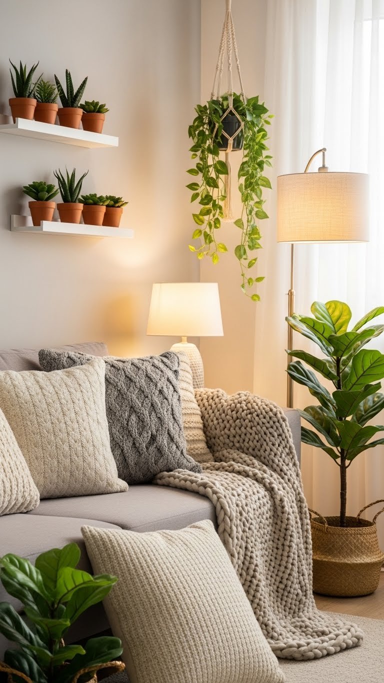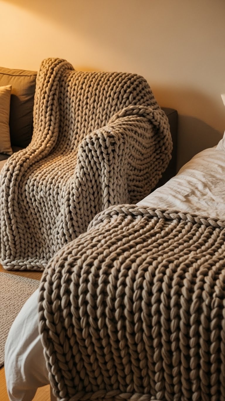 Drape chunky knit throws over the back of a sofa or the foot of a bed to add instant tactile warmth and visual depth. You’ll mix hand knitted textures in neutral tones, layering weight and movement without clutter.