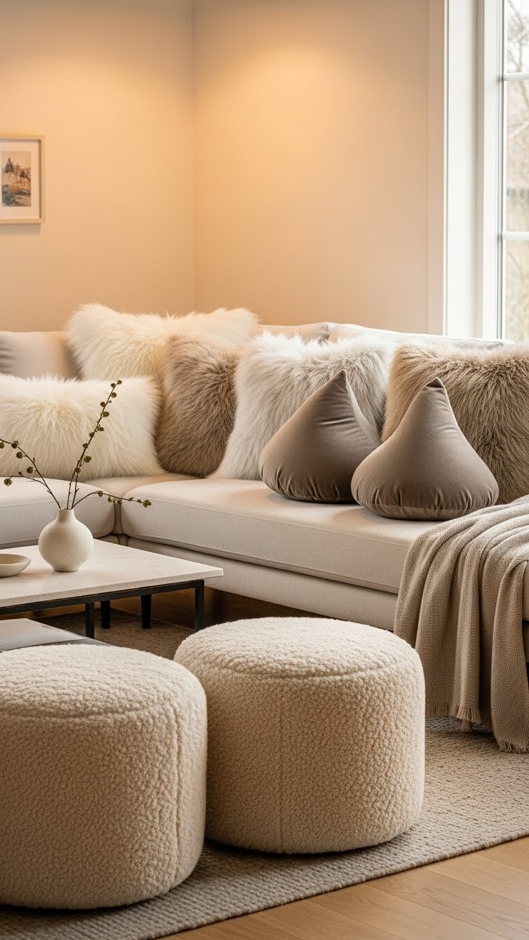 Bring in faux fur accent pillows to instantly up the cozy factor and add plush contrast to clean lines. You’ll want tactile layers that feel freeing: mix faux shearling ottomans nearby, pair neutral fur with sculptural velvet lumbar pillows, and keep shapes simple. Let touch guide choices — soft, uncluttered textures invite relaxation without sacrificing the room’s minimalist clarity.