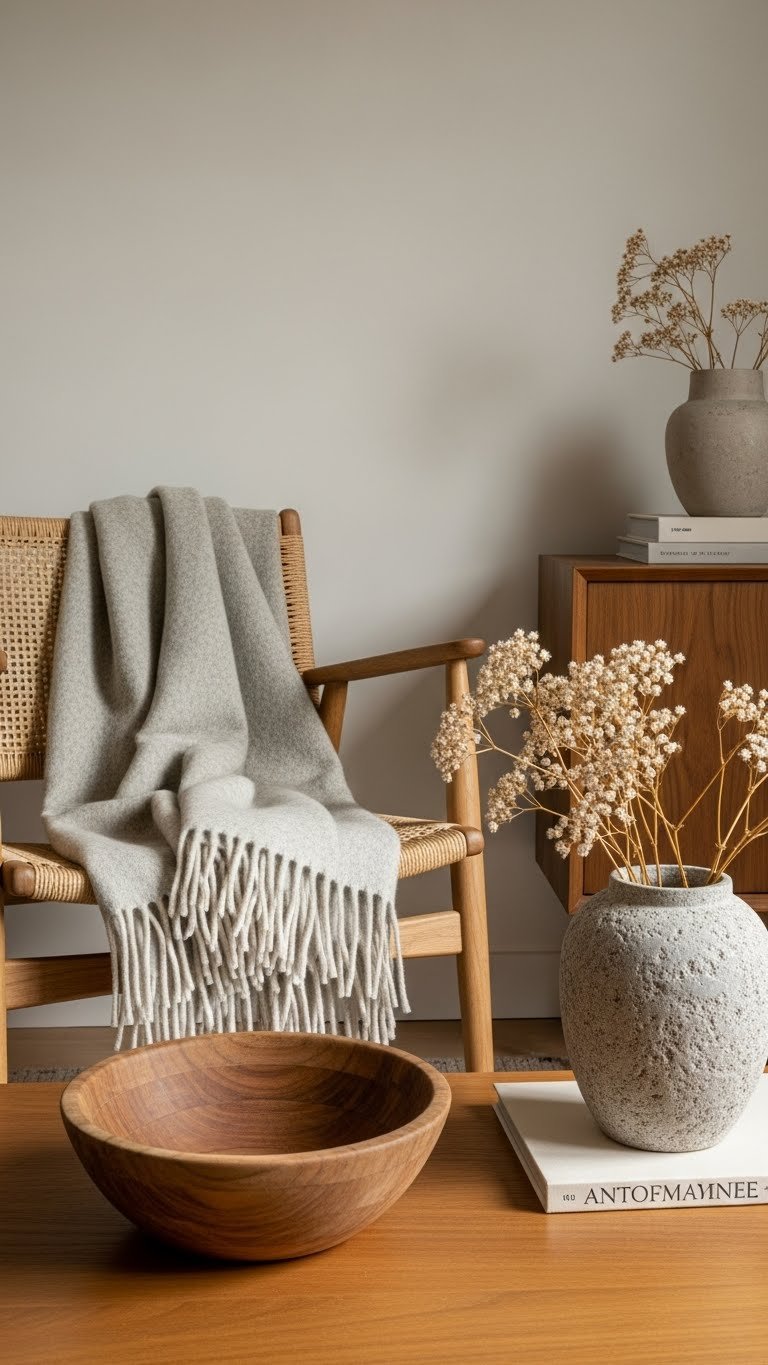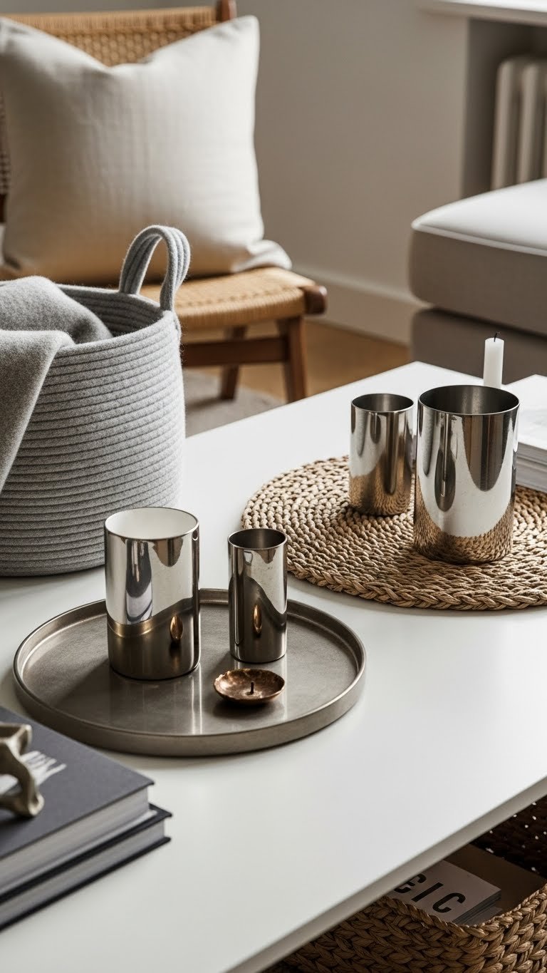 After you’ve pared down a coffee table to a single tray and a few carefully chosen objects, bring warmth and contrast into the room by mixing wool, woven fibers, and metal accents. You’ll tuck a soft throw into a wool basket, layer a lightweight woven pillow on a chair, and let subtle metal accents catch light, creating a calm, tactile space that still feels free.
