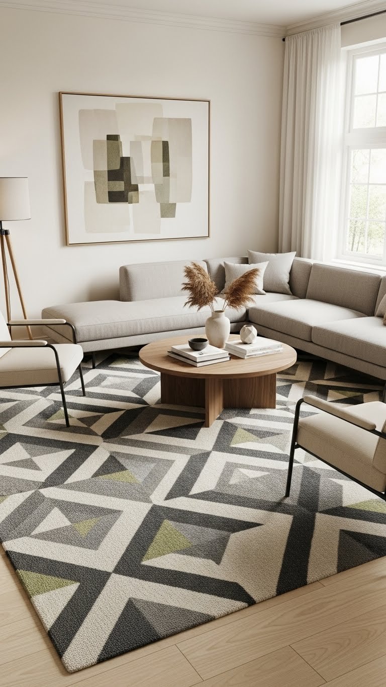 Anchor the room with a geometric rug that balances clean lines and cozy texture—its pattern should ground the minimalist palette while adding visual rhythm underfoot. You’ll pick bold patterns in muted tones to energize space without clutter. Choose low pile for tactile comfort and easy movement. Place it so furniture hugs edges, defining zones and freeing you to rearrange on a whim.
