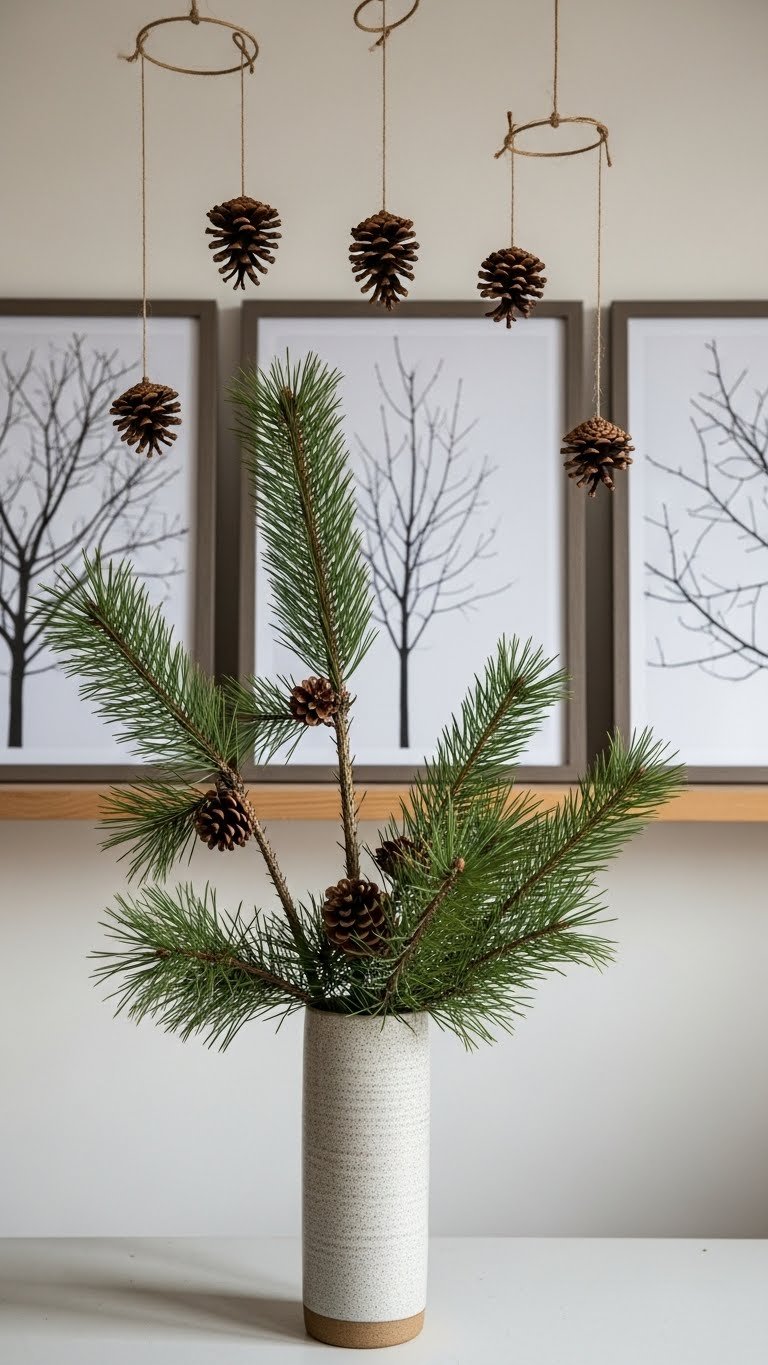 You’ll arrange simple stems in a narrow vase, suspend pinecone mobiles for playful motion, and lean branch silhouette prints against a shelf for graphic calm.