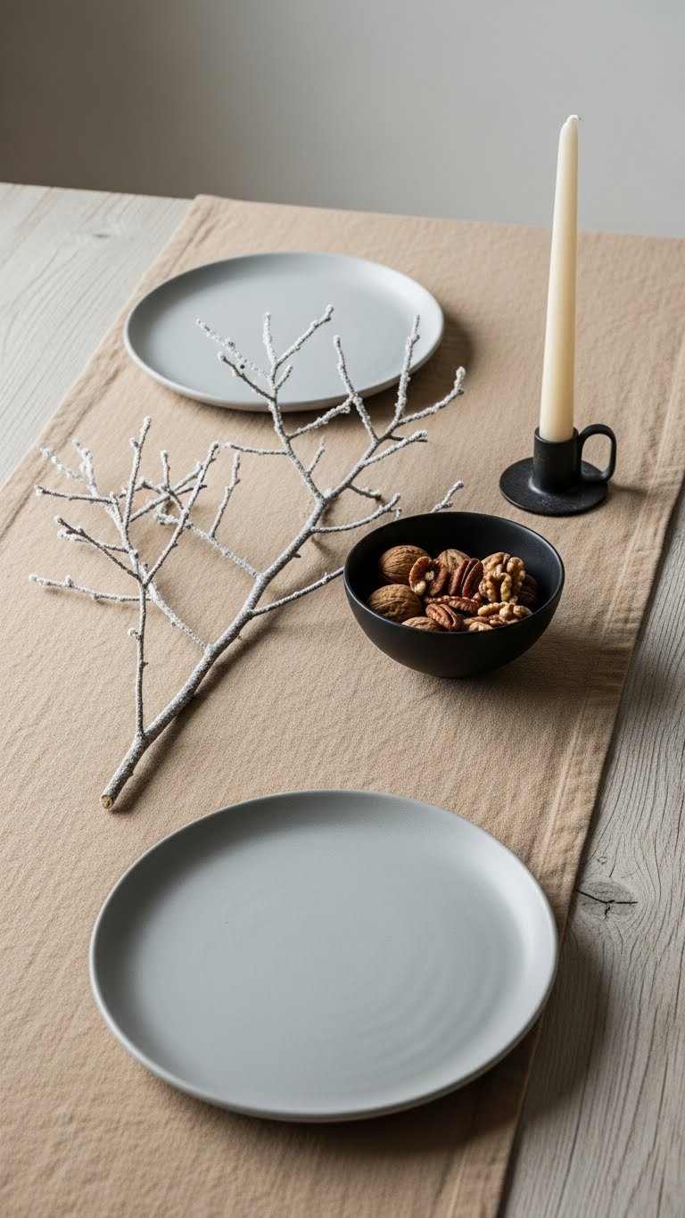 You’ll layer seasonal tableware sparingly, add a single minimal centerpiece—perhaps a frosted twig or small bowl of nuts—and leave space to linger.