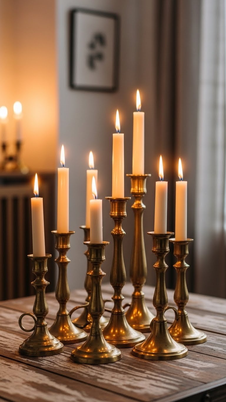 Layer vintage brass candlesticks into your winter palette to warm the eye and catch candlelight with a soft, metallic glow. You’ll love the way antique patina reads as lived-in elegance while tapered holders lend sculptural simplicity.