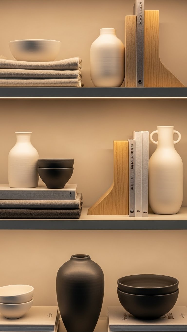 Curate your shelves with intention: pick a restrained palette of creams, greys, and warm woods and arrange objects so each piece breathes and contributes to the story.