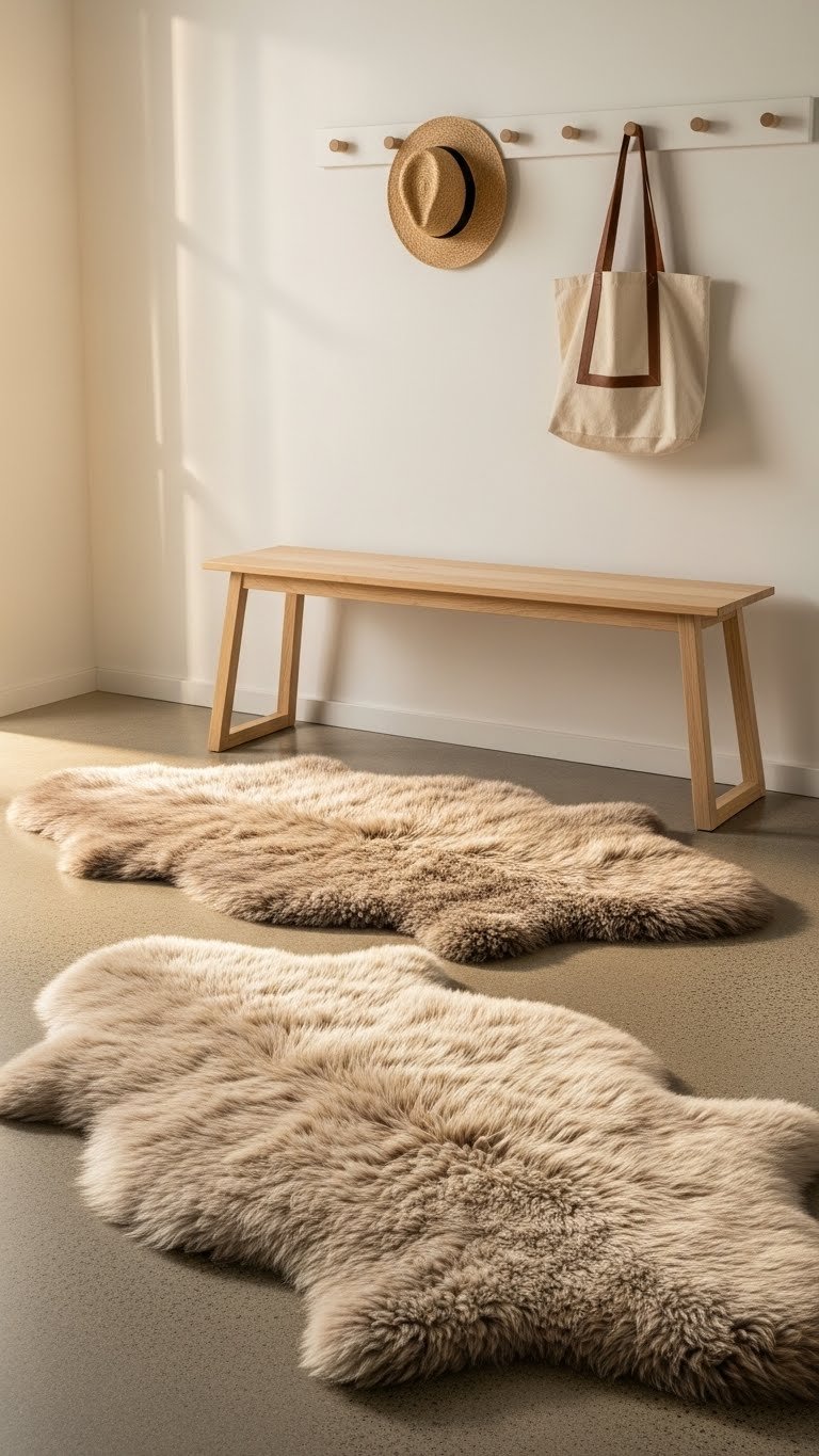 You’ll opt for a heated sheepskin where mornings bite, pairing it with a simple bench and hooks.