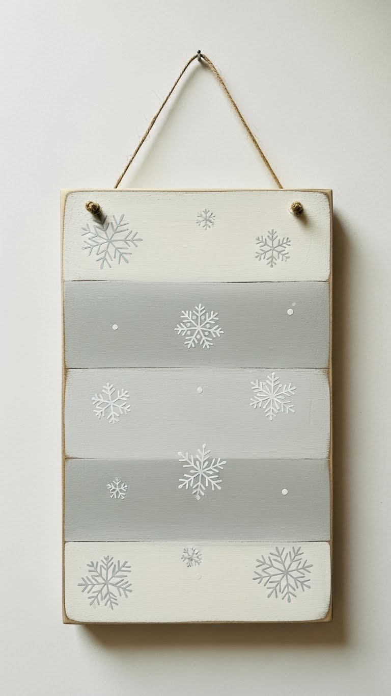 Want a quick way to signal winter without clutter? Choose a hand painted, minimalist wooden sign with soft gray or cream tones and subtle snowflakes.