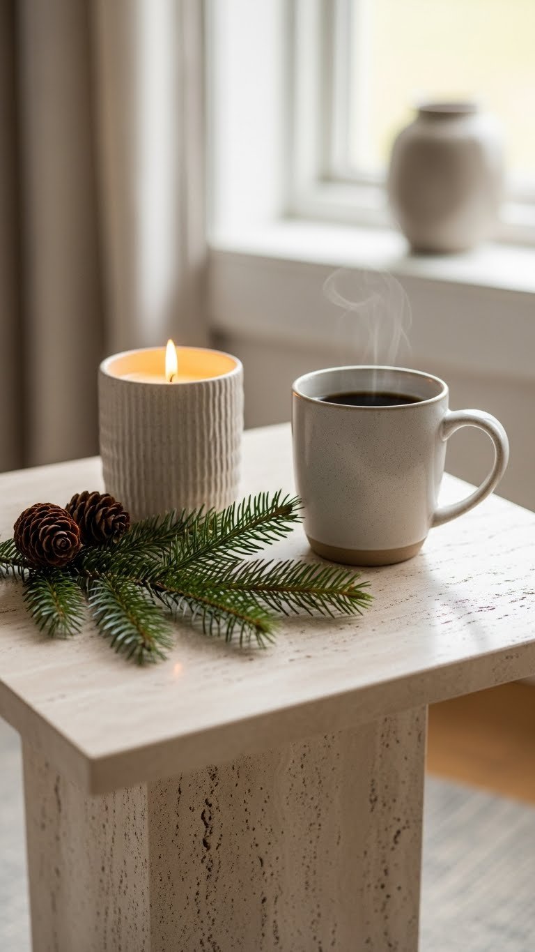 Place a warm mug, a tactile candle, or a single evergreen sprig to evoke calm, liberated winter living.