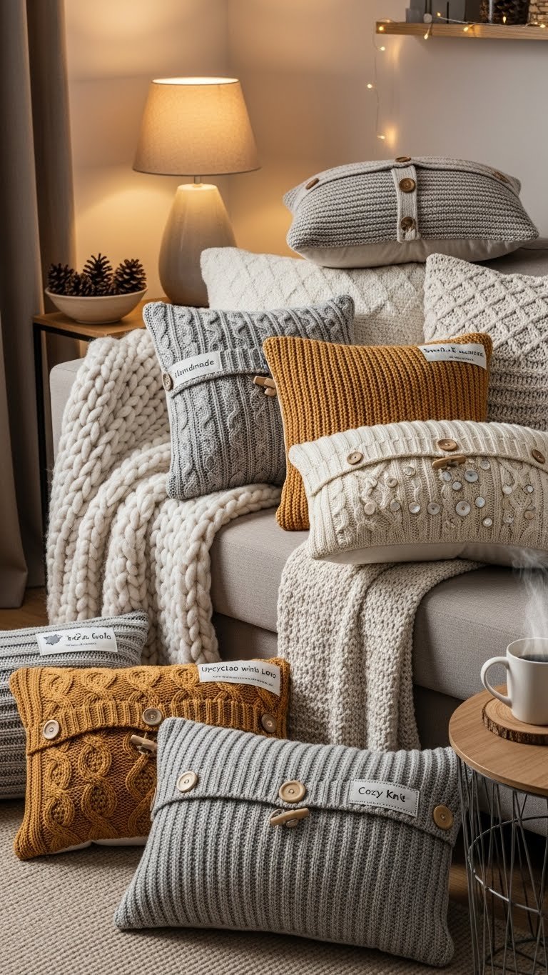 Give your old sweaters new life by turning them into soft, textured pillow covers that instantly cozy up a room. You’ll cut, sew, and celebrate imperfect edges; leave mismatched buttons as charming closures and show stitched labels for authenticity.