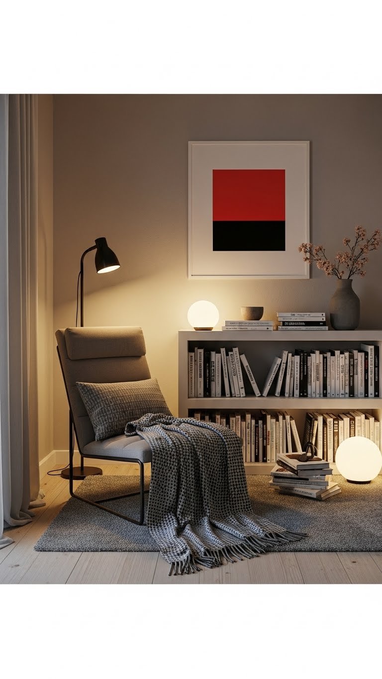 Keep surfaces uncluttered, choose neutral tones with one bold accent, and make it a liberating retreat for slow, focused reading.