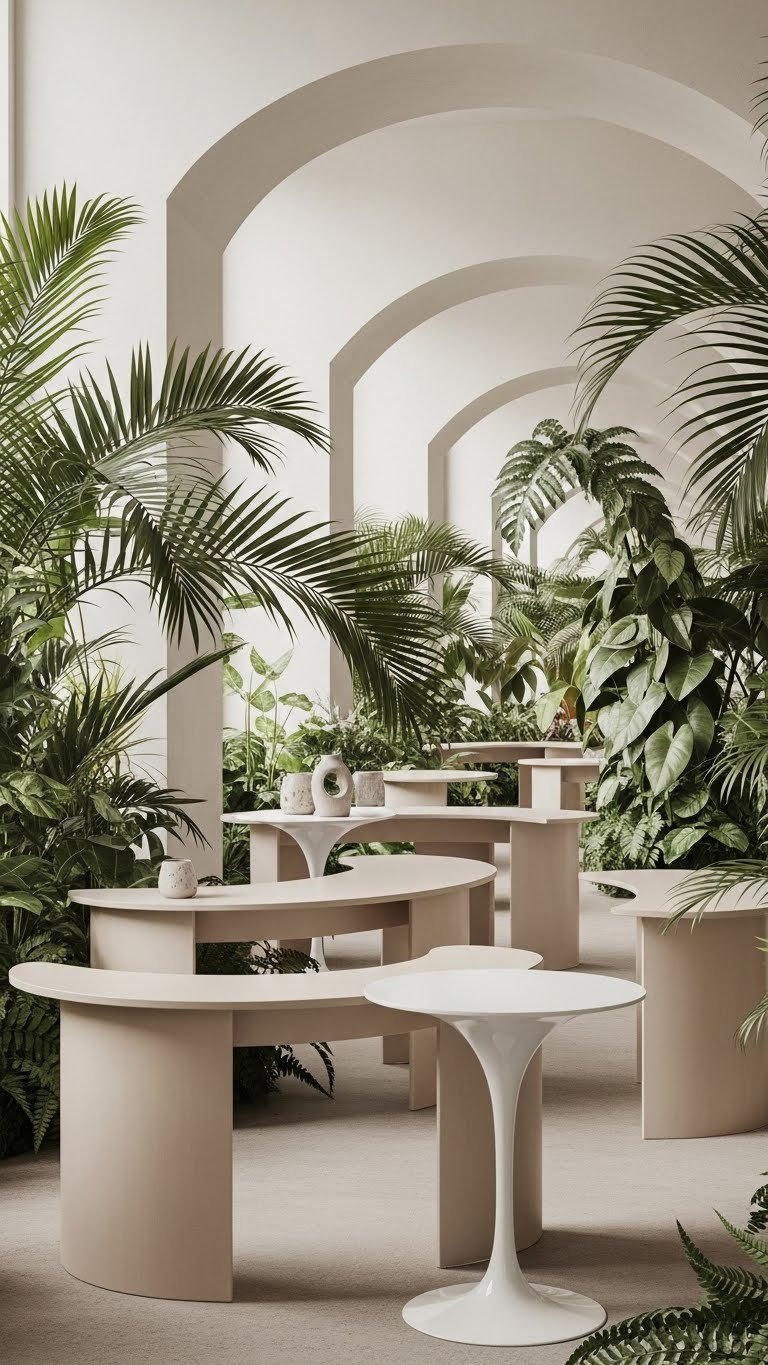 Let botanical silhouettes—curved palms, sculpted ferns, soft-edged pottery—introduce movement.