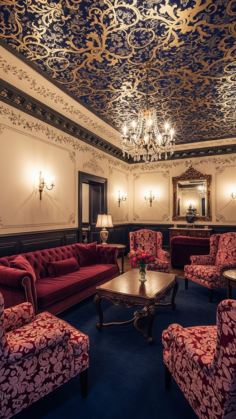 You’ll choose bold motifs or subtle texture to liberate the ceiling from invisibility, making the overhead plane an assertive, joyous element of your curated, sophisticated sanctuary.
