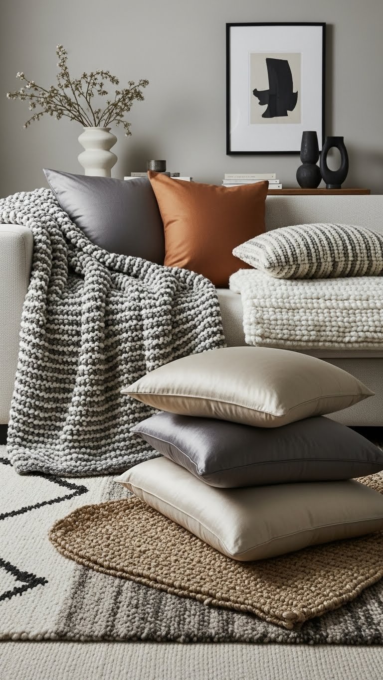 Layer texture deliberately by mixing throws, rugs, and cushions that vary in scale, pile, and weave so each piece reads distinct yet cohesive. You’ll balance bouclé throws with low-pile rugs and silk cushions to contrast matte and sheen, chunky and sleek. Stick to restrained tones, let tactile variety create movement, and choose pieces that feel effortless, intentional, and liberating.