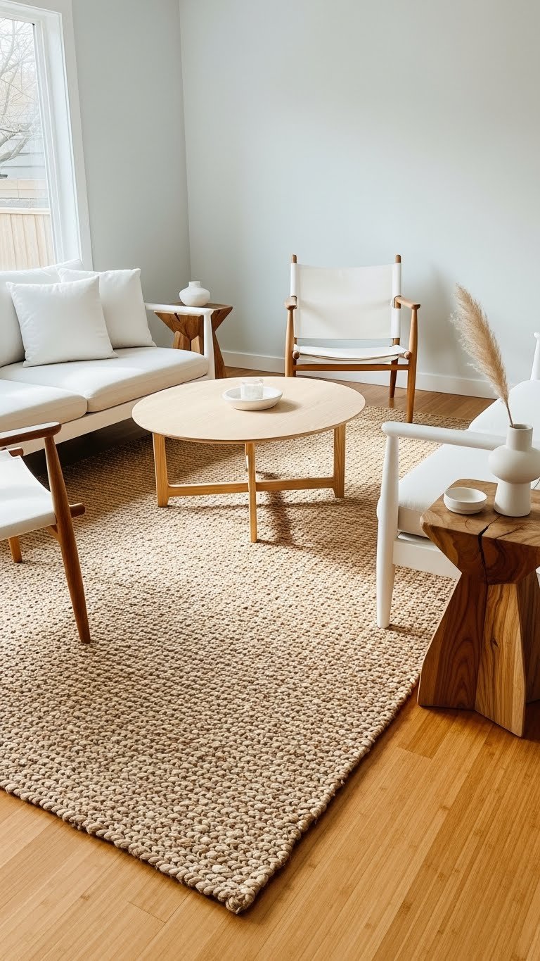 Drawing the eye and grounding mixed woods and cool whites, a statement natural-fiber rug anchors the room while adding texture and warmth you can feel. Choose earth toned sisal or handwoven seagrass to create a calm foundation that resists trends.