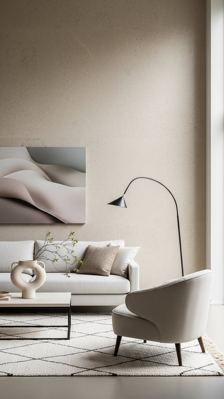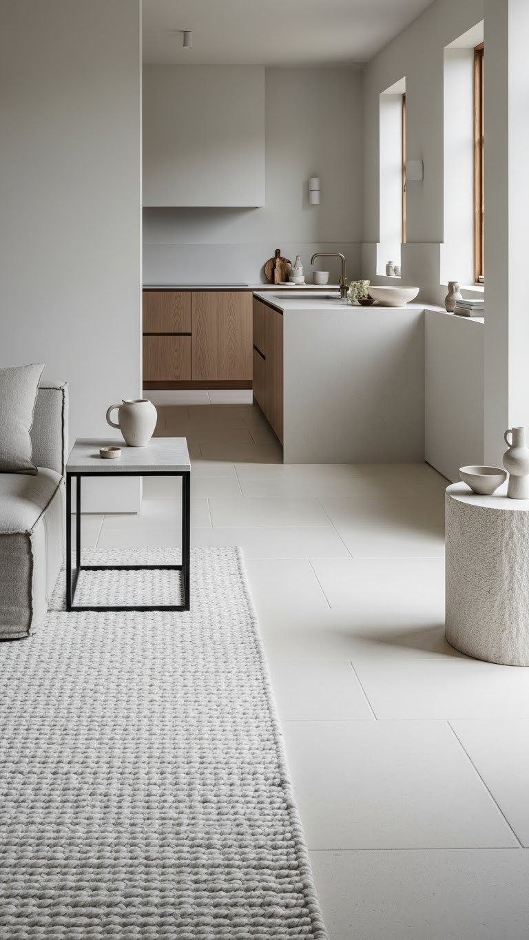 Pair that tactile rug with matte stone or porcelain surfaces to balance softness with a subtle, modern edge. You’ll choose tactile porcelain pairing for countertops or side tables, keeping lines clean and tones muted.