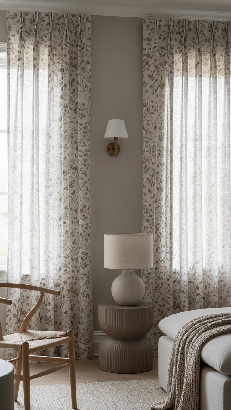 Softening a neutral room with linen curtains that carry a gentle pattern gives you texture and visual interest without breaking the calm.