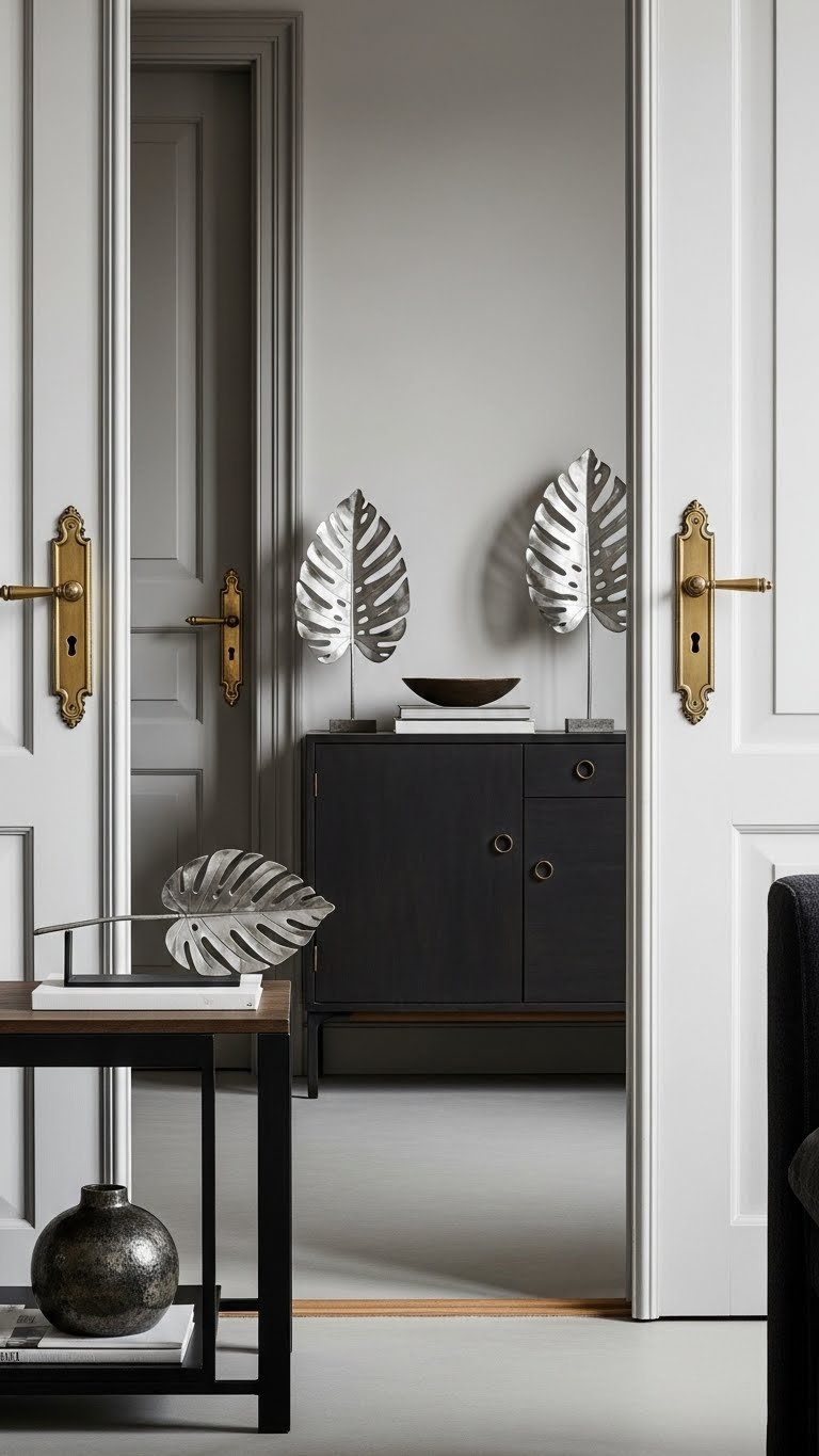 Introduce antique brass or brushed metal accents to give neutral spaces a grounded, curated feel. You’ll mix patinated hardware on doors and cabinetry with sleek brushed leaf accessories to add texture without fuss.