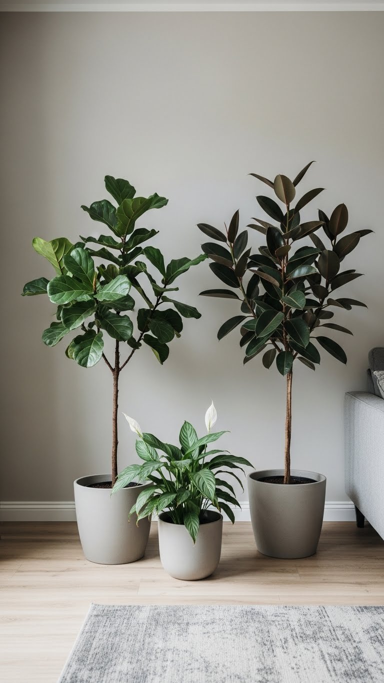 Choose a large fiddleleaf in a simple pot or an oversized rubberplant to anchor a corner. You’ll balance minimalism with organic energy, let plants breathe, and keep arrangements uncluttered for a liberated, calm vibe.