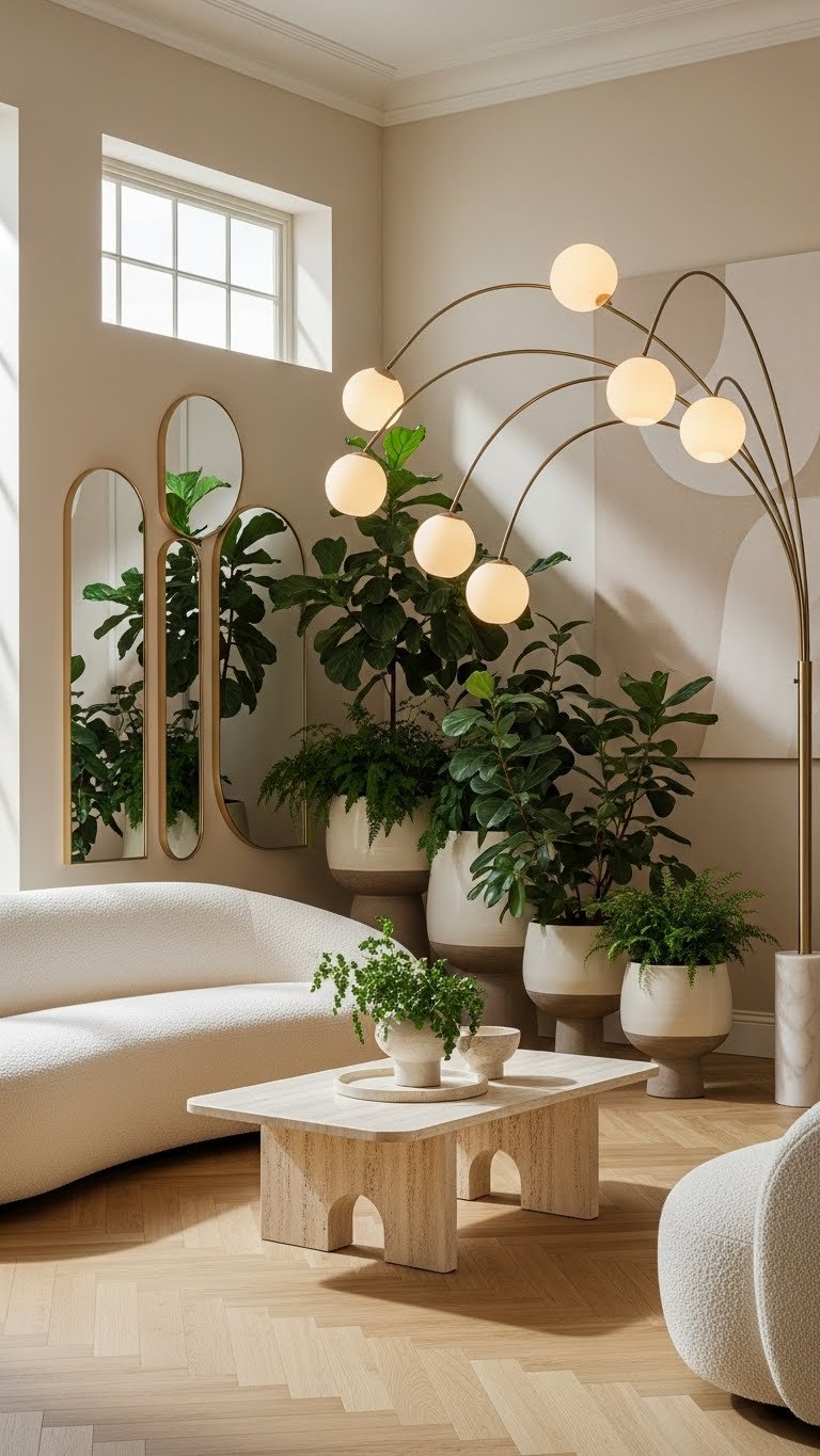 You’ll choose curved lighting to trace soft silhouettes, select round planters for flowing greenery, and add arched mirrors or poufs.