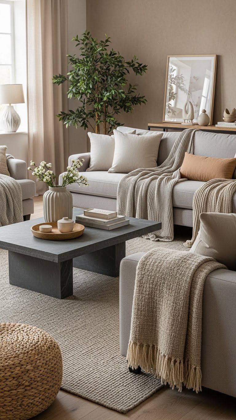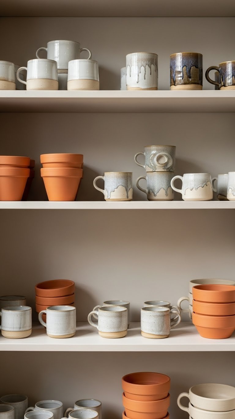 Once you’ve balanced warm and cool neutrals with the 80-20 rule, bring in textural ceramics and handmade pottery to add tactile interest and human warmth. You’ll curate handbuilt mugs on open shelving, cluster terra cotta planters with sculptural glaze pieces, and rotate small collections seasonally.