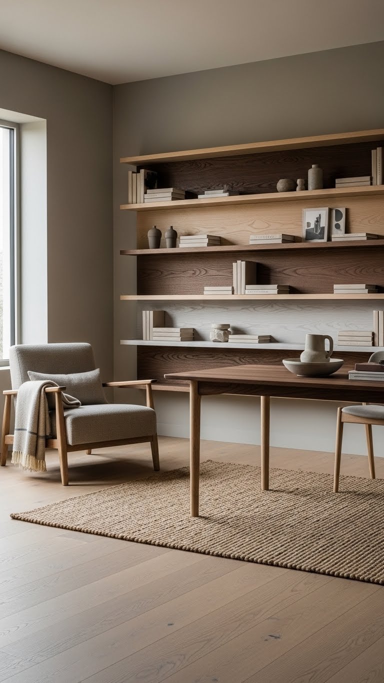 Blending different timber species lets you layer warmth and character without overwhelming a neutral palette. You’ll mix oak, walnut and ash to create rhythm: think mixed grain shelving against lighter walls and a contrasting leg table as a focal point.