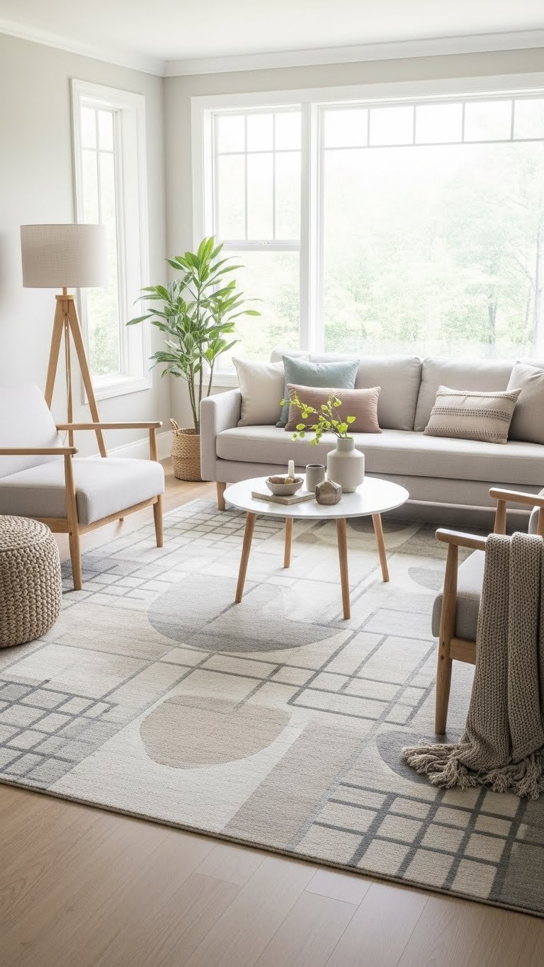 Want a rug that grounds the room without stealing the show? Choose low contrast geometrics in soft beiges or greys so patterns whisper, not shout.