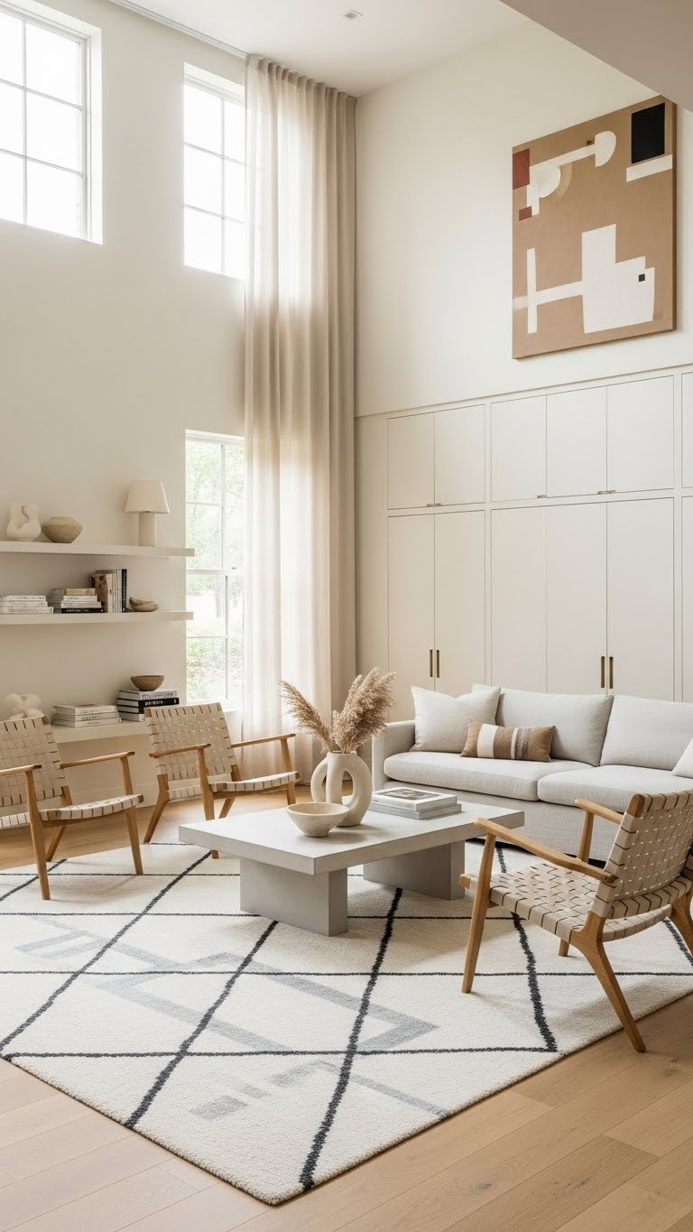 The quiet geometry of your rug sets the tone, so keep everything else intentional and edited. You’ll choose pieces with purpose, rely on functional storage to hide necessities, and curate surfaces to breathe.