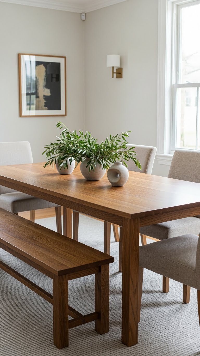Anchor your dining area with stained wood to give a neutral scheme a grounded, tactile center that feels both timeless and on-trend.