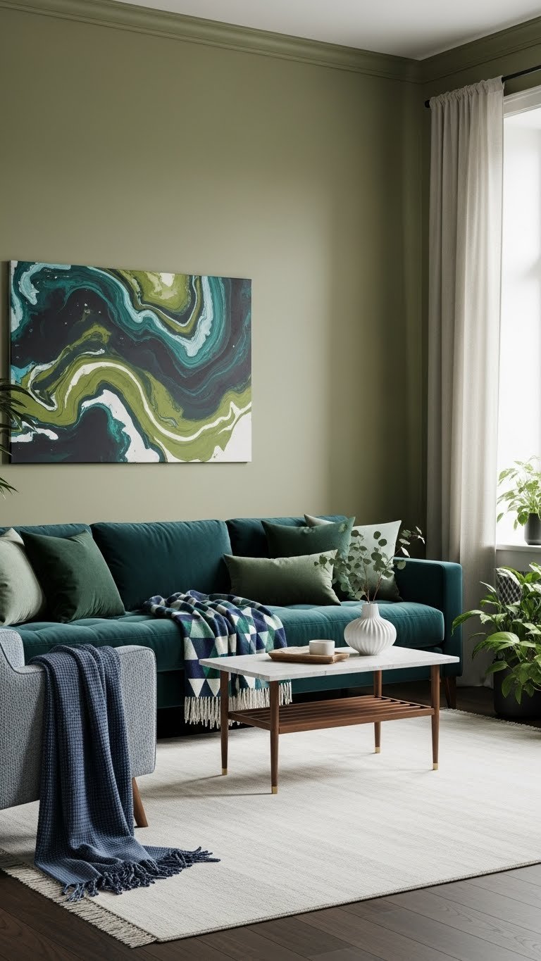 You’ll use muted olive foundations for walls and textiles, letting deep teal anchors ground seating and cabinetry. The result feels liberated yet restrained; you control warmth and contrast while staying timeless, modern, and quietly bold.