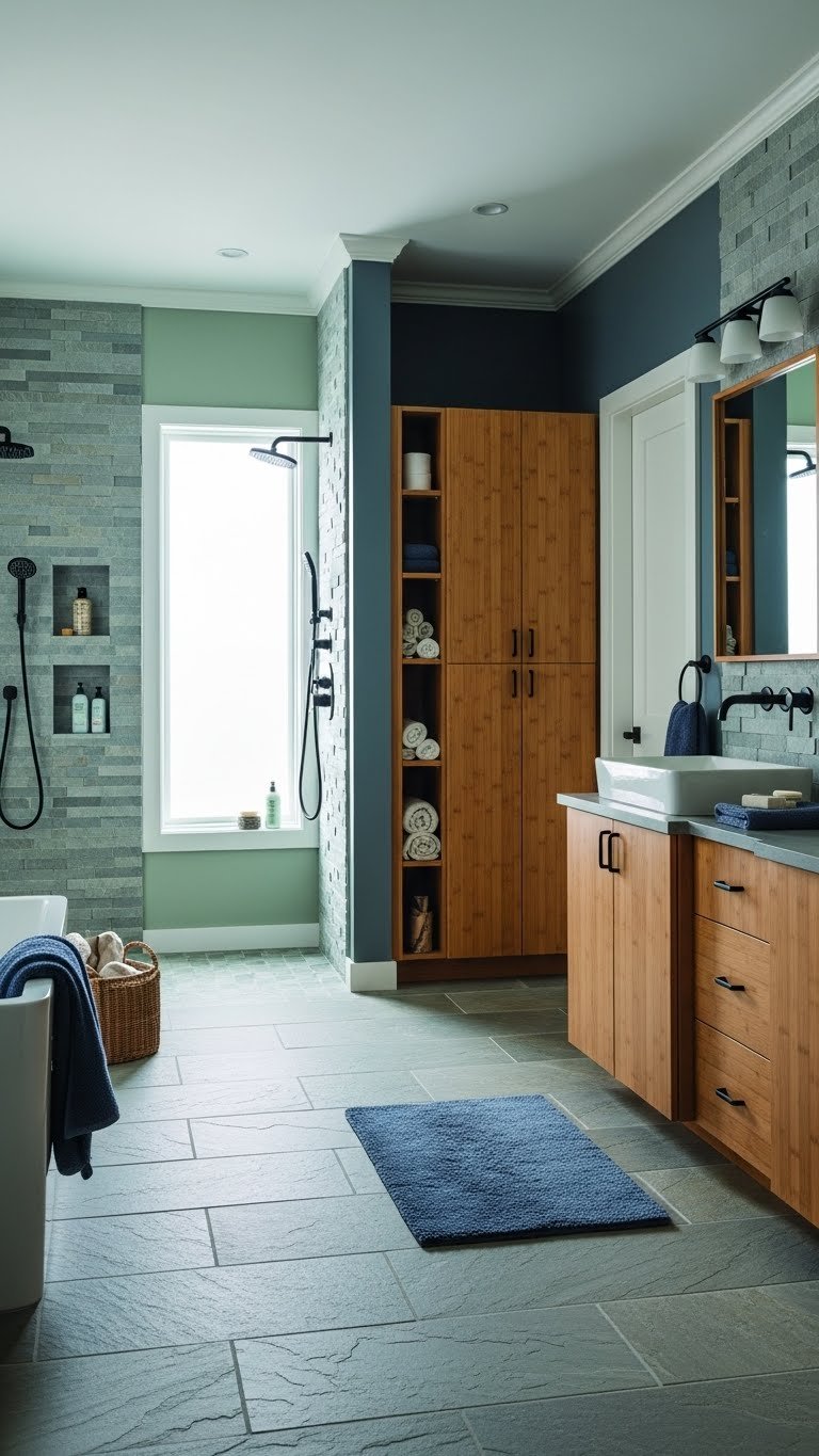 Embrace tactile stonework underfoot and on feature walls, pair with warm bamboo cabinetry, and choose matte fixtures for understated durability.