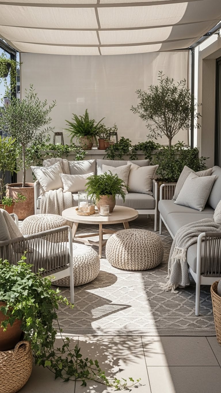On your patio or balcony, neutral soft furnishings turn outdoor spaces into calm extensions of your home, grounding gatherings with layered textures and muted tones.