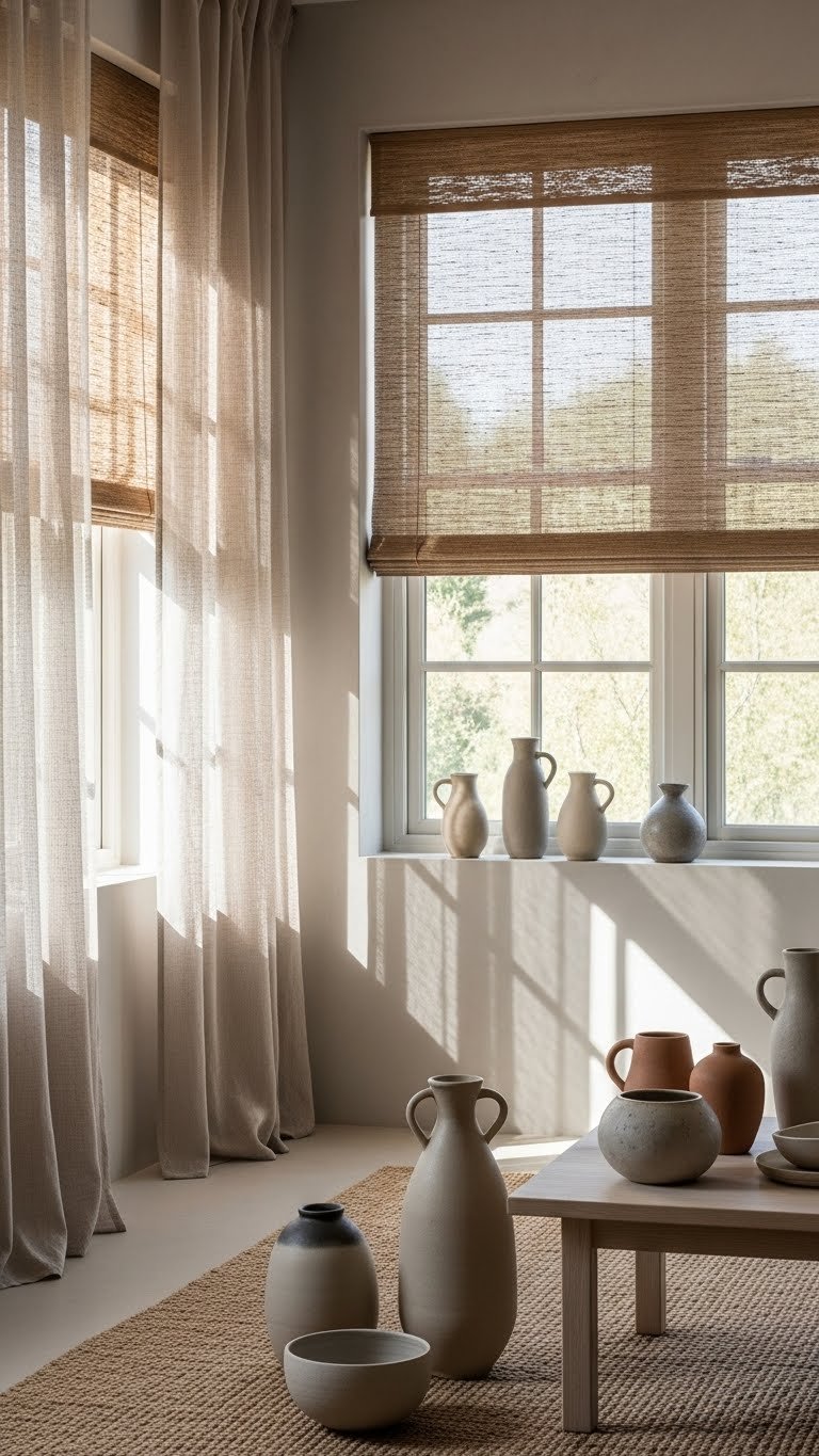 After anchoring your room with tactile ceramics, bring that same considered restraint to windows with natural-fiber treatments that balance light, texture, and privacy.