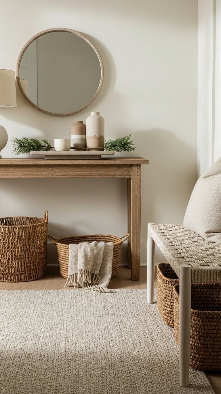 Create a calm, welcoming entry by layering creamy neutrals—painted walls, a soft rug, and a bench—then anchor the look with a simple pine-branch tray on the console. You’ll get a pine scented welcome that’s subtle, fresh.