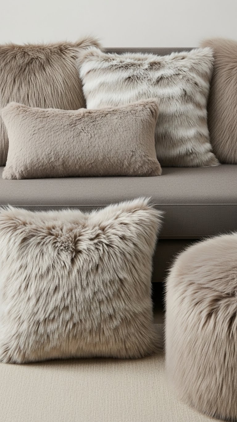 Plush up your sofa with a mix of faux fur pillows in varying pile lengths and neutral shades to add instant warmth and tactile contrast. You’ll pair a soft neutral lumbar with chunkier square pillows, balance glossy and matte fur, and float a coordinating faux fur ottoman nearby.