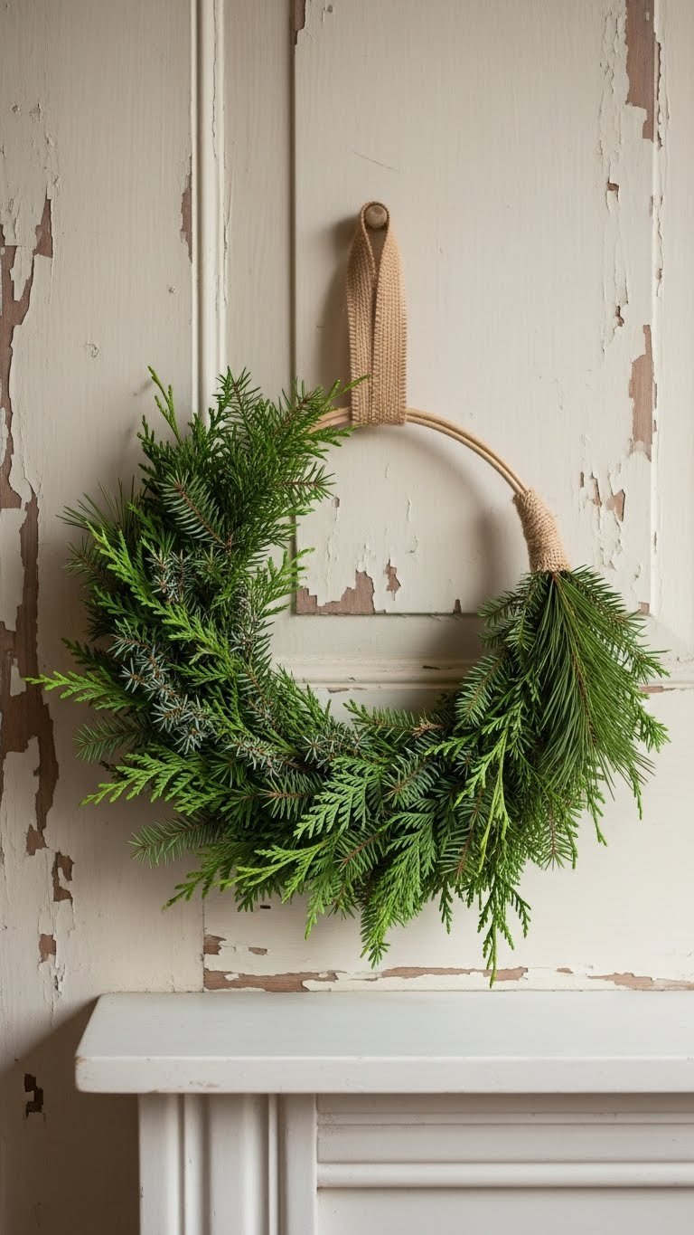 Tie a simple hoop of fresh or faux evergreens with natural twine to make a quiet, modern wreath that reads calm and collected.