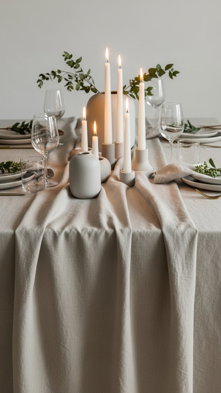 You’ll pair linen texture with simple tapered candles, arranging them in staggered heights for effortless candlelight styling. Keep accessories minimal—a few matte ceramic vessels or sprigs—so the scene breathes and feels liberating.