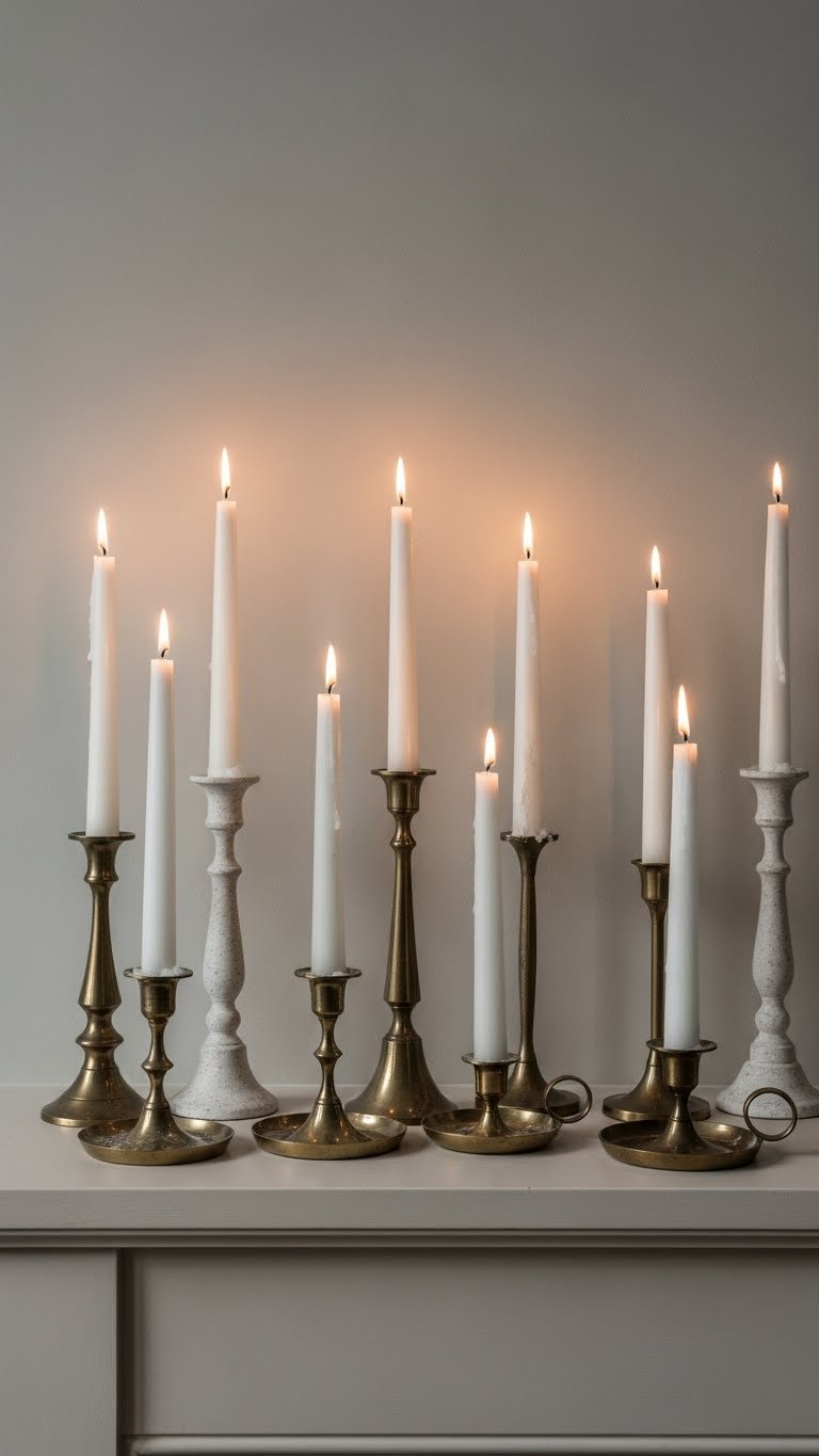 Arrange antique taperstones in varying heights, group matte brassholders with patinaed white tapers, and leave negative space for breathability.