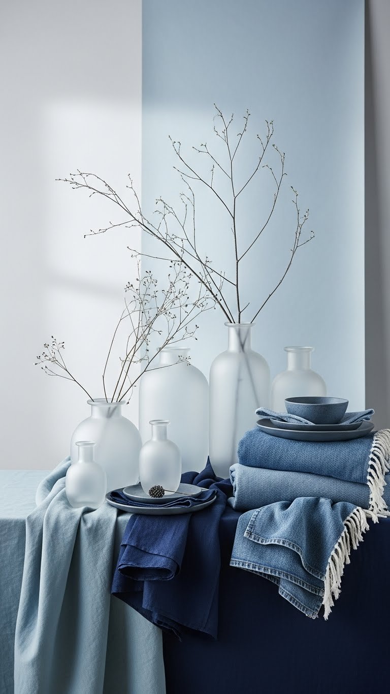 You’ll pair icy slate ceramics with frosted denim throws folded small, add sculptural branches for height, and leave breathing room.