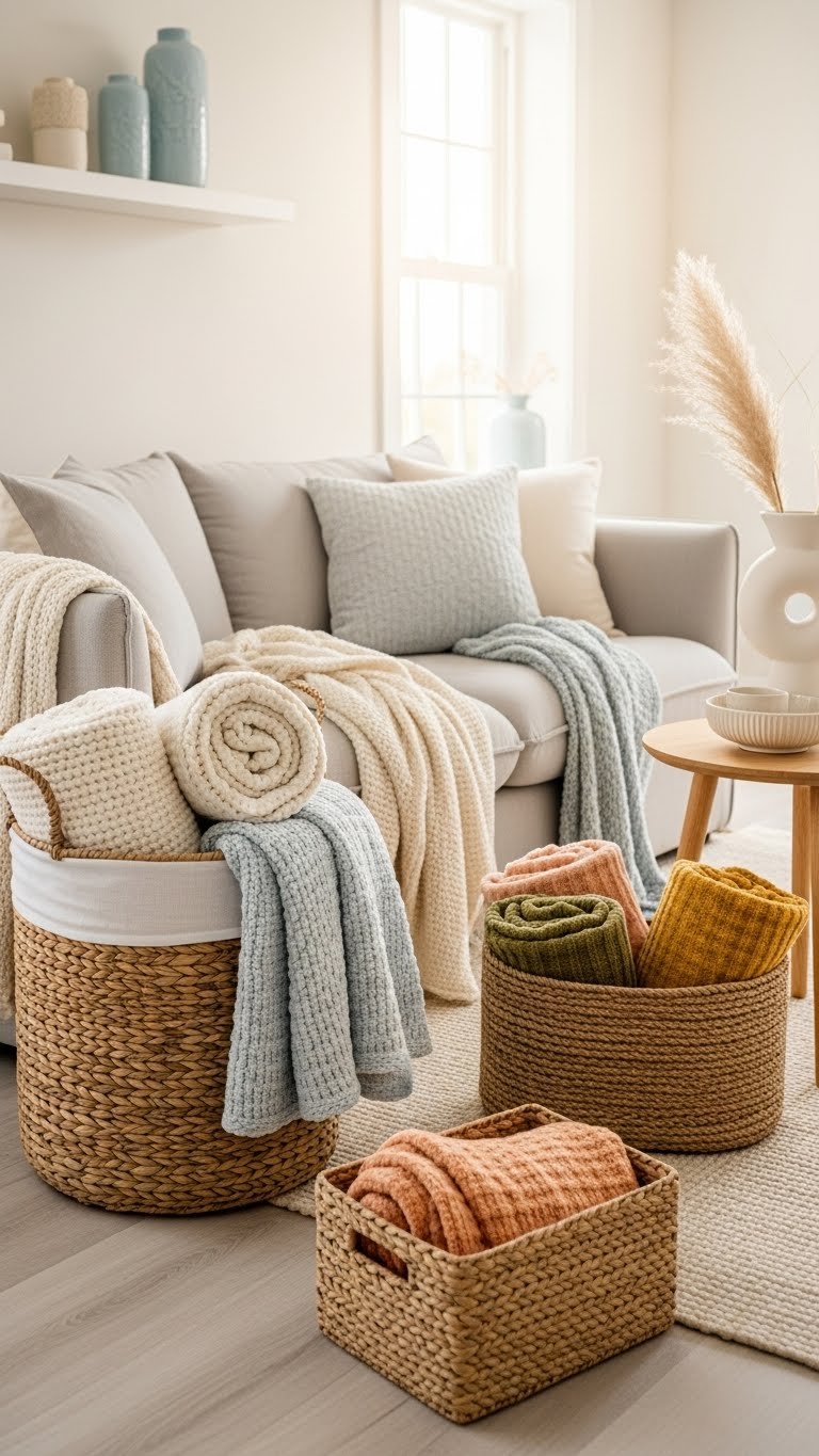 You’ll create neat blanket storage that feels effortless: mix shapes, lean a tall basket by the sofa, and use breathable liners to protect fibers.