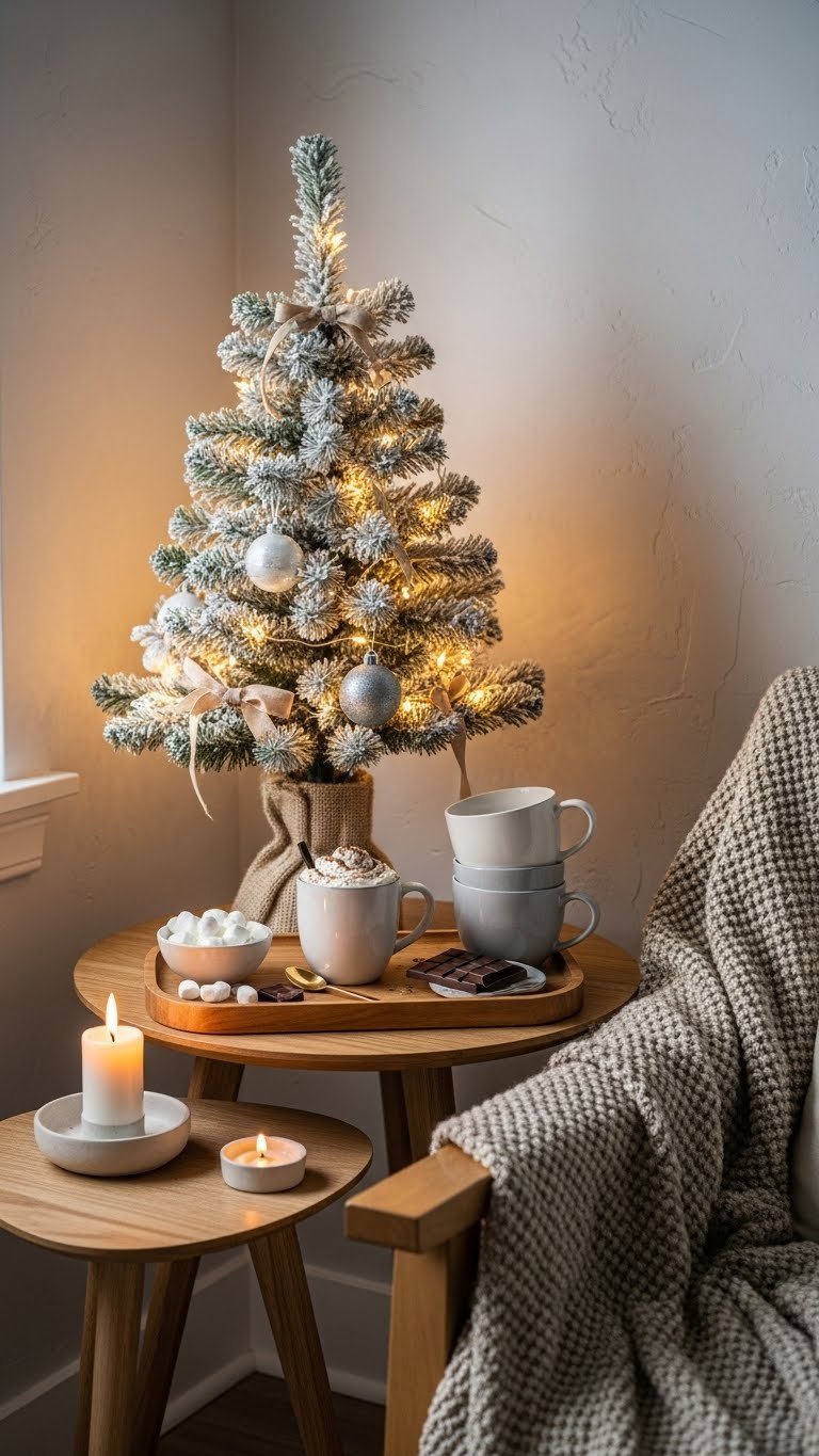 If you loved the calm, tactile feel of the hot chocolate station, carry that same quiet energy into a flocked mini tree with warm white lights.
