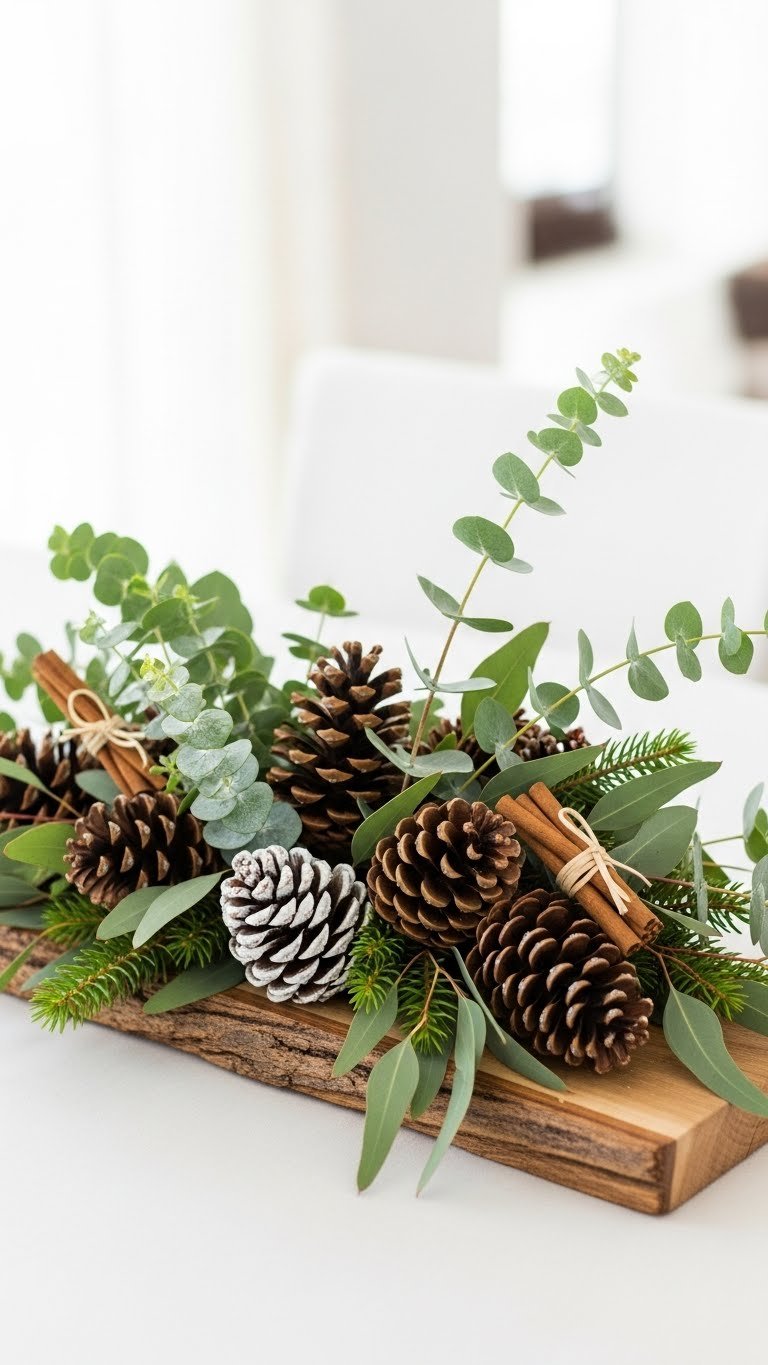 Bring together eucalyptus sprigs and a scattering of pinecones to create a centerpiece that feels fresh, restrained, and quietly modern. You’ll nest dried eucalyptus around varied pinecones on a low tray or wood slab, add a few cinnamon bundles for warmth, and leave negative space so the arrangement breathes.