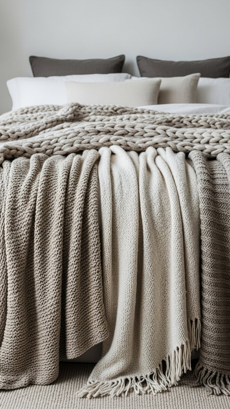 You’ll play with wool textures and neutral tones, draping throws casually for effortless charm. Alternate weights and lengths in your bed layers, keep colors muted, and let the mix feel liberated yet curated — minimal, cozy, and unmistakably modern.