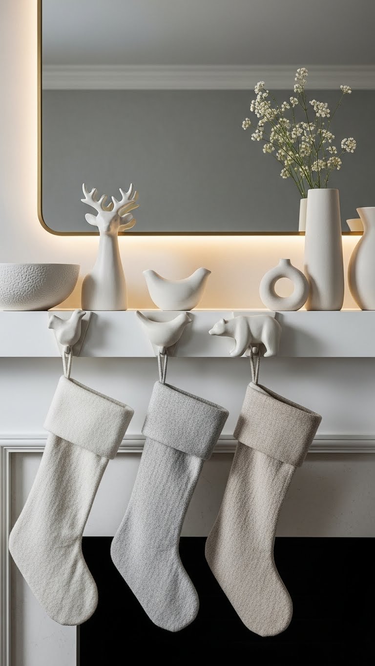 On an ironstone shelf, hang neutral stockings to turn a simple display into a quiet winter statement — you’ll balance sculptural ceramic tones with soft wool and linen for a restrained, modern mantel. Choose ironstone stockingholders that read like small sculptures, mix textures sparingly, and follow neutral textilecare tips to keep fibers soft. You’ll create calm, liberated holiday visual rhythm.