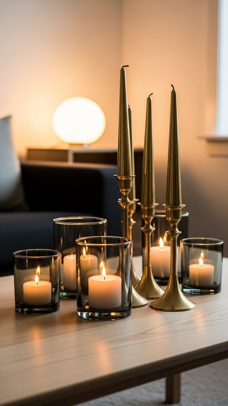 Framed by clean lines and soft light, a cluster of glass and brass candles on your coffee table makes a quietly modern statement: clear glass votives and taller tapered holders catch the flame while warm brass anchors the arrangement, creating a chic contrast of transparency and glow.