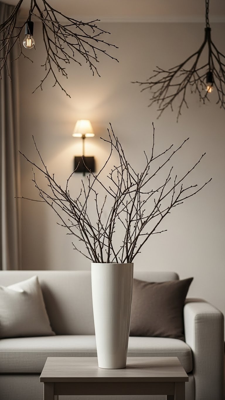 Bring a sculptural calm to your living room by tucking a bundle of bare branches into a tall ceramic vase—its clean silhouette and natural textures anchor the space without fuss.
