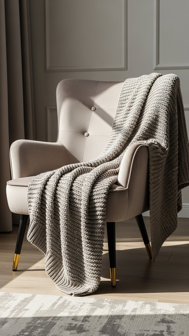 Layer a chunky knit blanket across the arm or back of your sofa to add instant texture and cozy appeal—drape it casually so large stitches and soft yarn read like a tactile invitation.