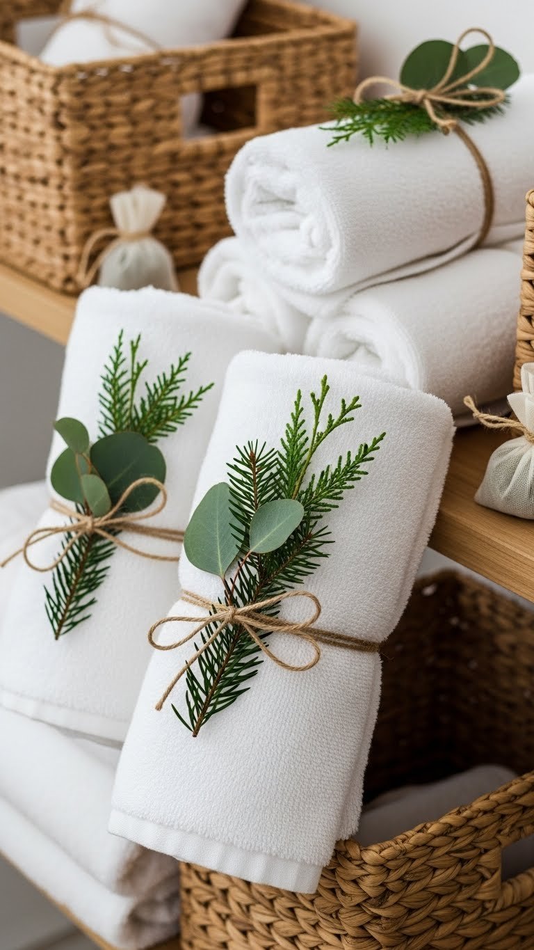 Roll up crisp white towels and tie them with natural twine, then tuck in a sprig of evergreen or eucalyptus for an instant spa-like vignette that reads clean, seasonal, and effortlessly curated.