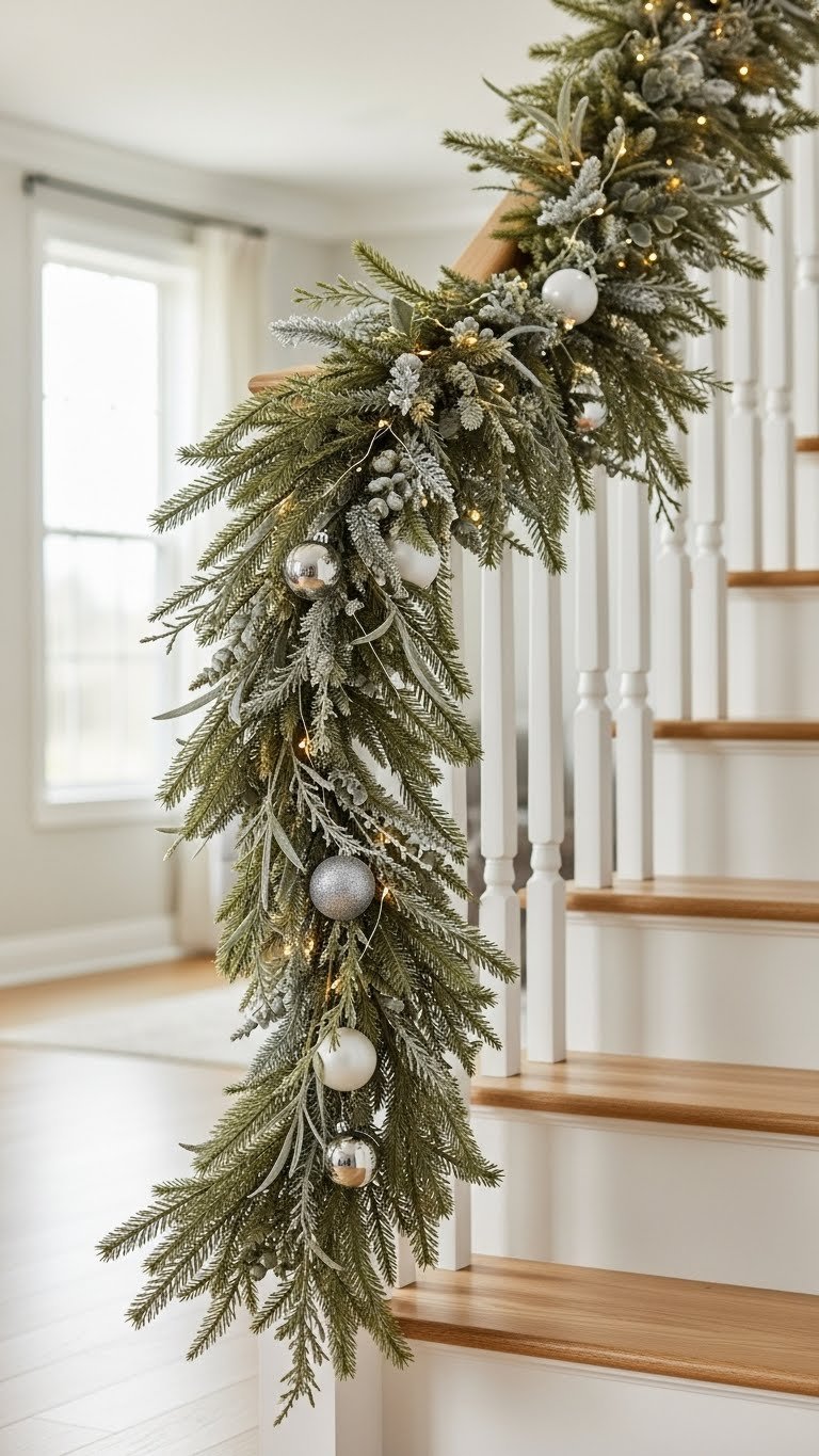 You’ll create effortless movement and soft silhouette without seasonal fuss. Secure ends discreetly, rotate periodically to reduce wear and ease staircase maintenance. Choose UV-resistant stems for longer garland lifespan, stick to muted tones, and let open sightlines keep the look free and calm.