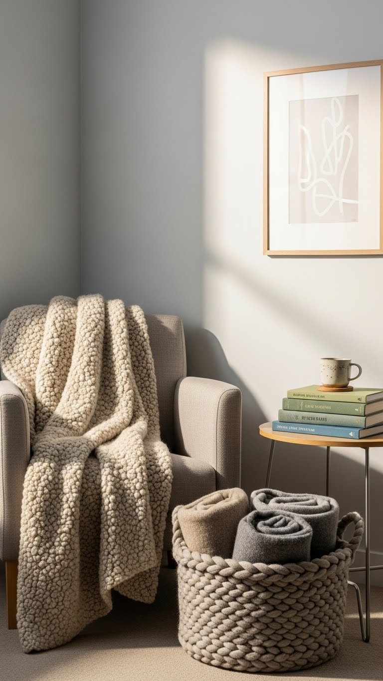 Tuck a plush wool throw over the arm of a compact armchair and create a small, intentional reading nook that feels both calm and tactile. Place a low wool basket beside it for extra blankets, add a slender side table, and arrange a tidy bookstack vignette with muted covers.